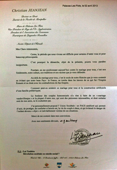 Le maire (UMP) de Palavas-les-Flots (Hérault) Christian Jeanjean a fait distribuer dans les boîtes aux lettres de ses administrés une lettre à en-tête de la mairie, accompagnée d’un tract, pour marquer son opposition au mariage pour tous.