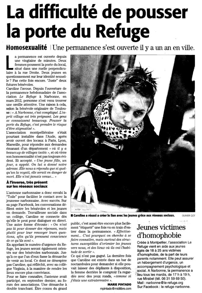 Caroline l’avoue : depuis l’ouverture de la permanence hebdomadaire de l’association le refuge à Narbonne, en mars 2012, personne n’est venu trouver une oreille attentive. Une raison à cela, selon la bénévole originaire de Toulouse : « … à Narbonne, c’est compliqué. L’esprit village est très prégnant. Les gens se connaissent beaucoup. Pousser la porte du refuge, c’est prendre le risque d’être stigmatisé ».