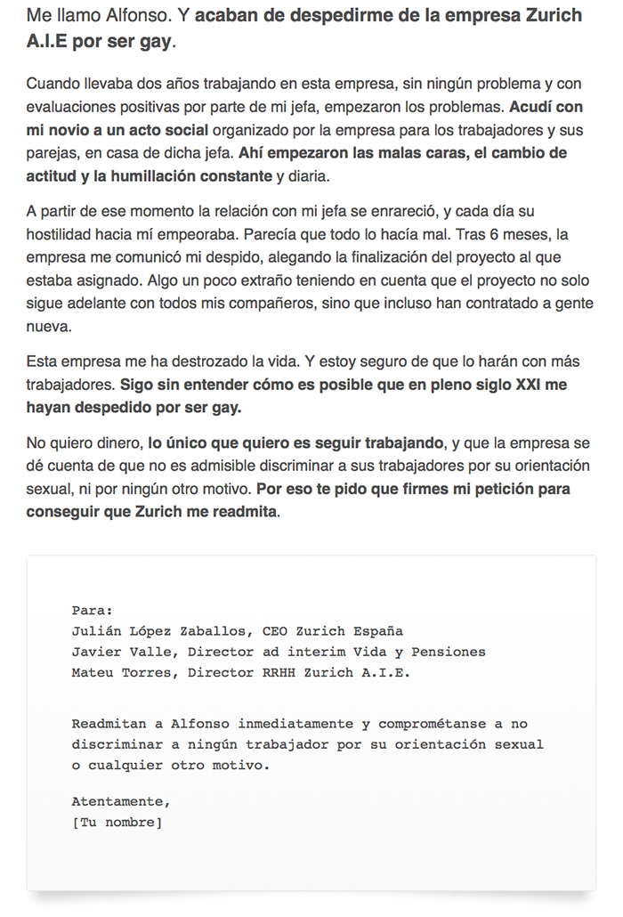 Pour signer la pétition : http://www.change.org/es/peticiones/zurich-espa%C3%B1a-readmitan-al-trabajador-despedido-por-ser-homosexual
