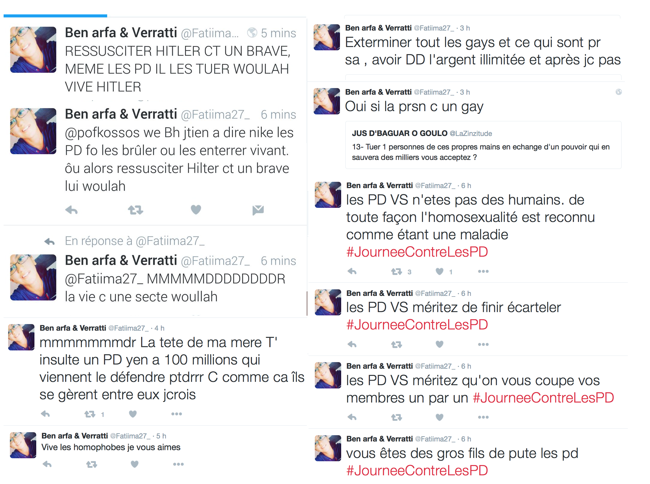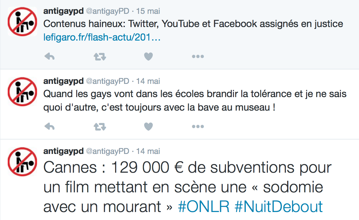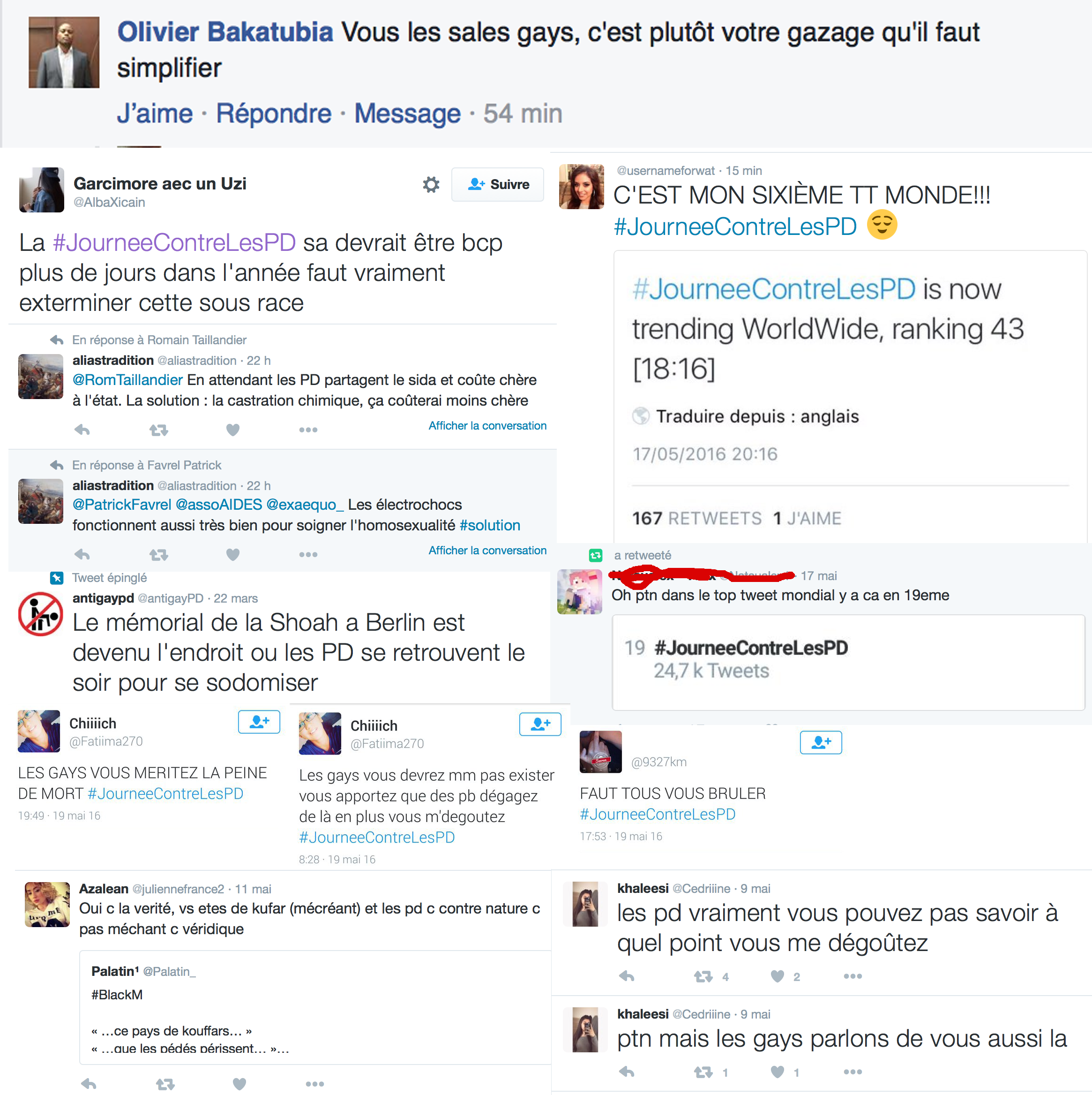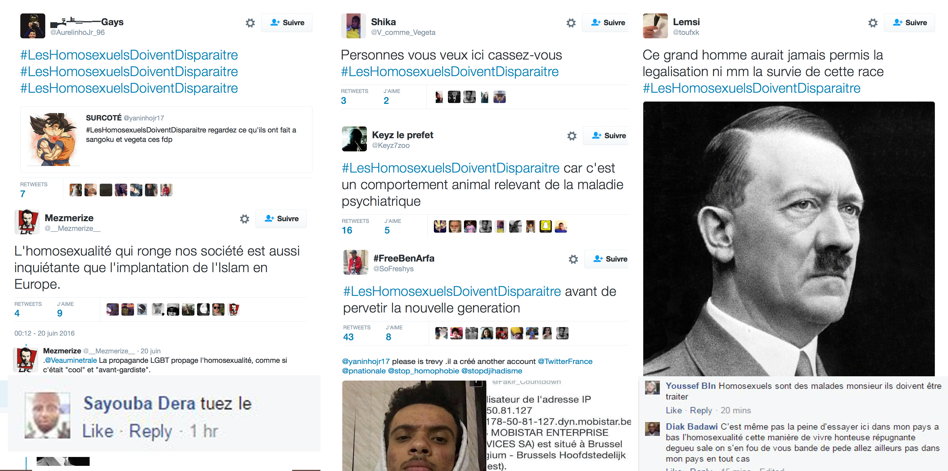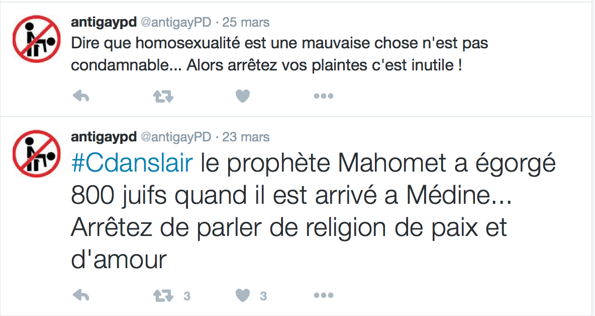Voici une liste de quelques-uns des messages que nous avons reçu depuis le 17 mai dernier. Les posts ont souvent été supprimés, suite à nos signalements, mais tous les comptes n’ont pas été suspendus.
