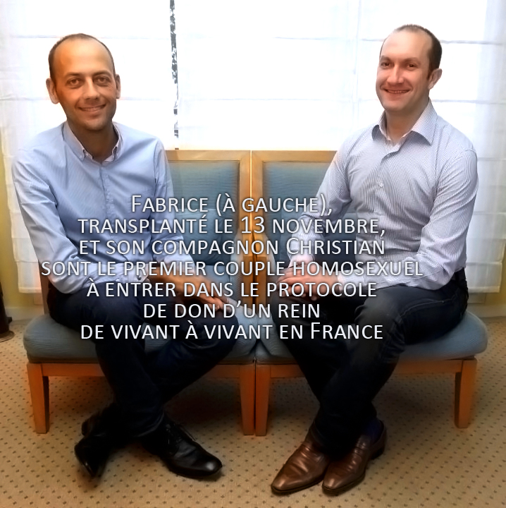 Fabrice doit trouver un nouveau donneur. Sa mère, sa sœur et sa cousine s’avérant ne pas être compatibles, son compagnon, Christian, qui l’est lui, se propose. Fabrice hésite. « D’un coup j’ai freiné, plein de questions m’ont assailli : ferais-je la même chose pour lui ? Lui qui est en pleine santé, dans quelle aventure est-ce que je l’entraîne ? », se souvient-il. Puis, saute le pas.