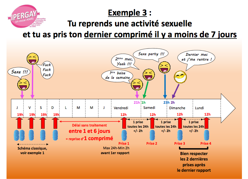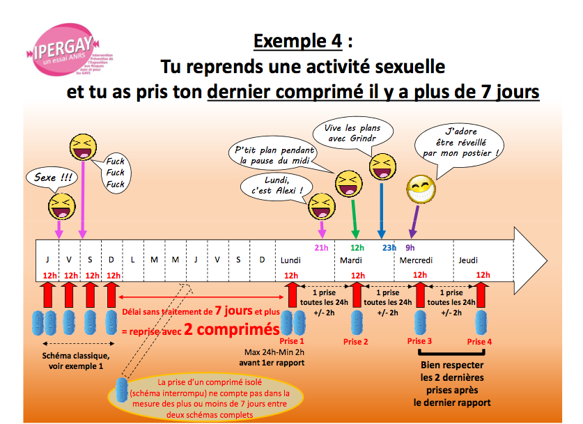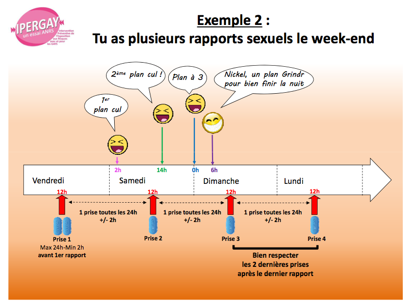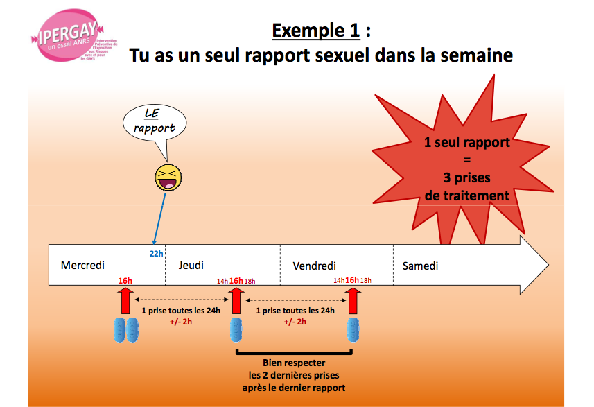 Par ailleurs, une étude pharmacocinétique [évaluation des effets des molécules dans l’organisme, ndlr] de la double dose initiale de Truvada utilisée dans l’essai, démontre la bonne tolérance de cette posologie et la présence du médicament à des taux très élevés dans le sang et la salive (les dosages dans le tissu rectal sont en attente) dans les une à deux heures après la prise, ce qui valide aussi ce schéma de prise à la demande dans cette étude (1).