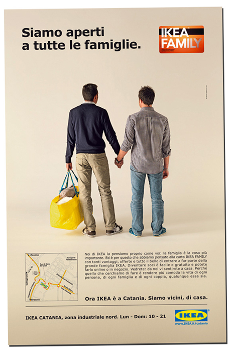 Ikea ya se ha manifestado en diversas ocasiones a favor de las uniones homosexuales en Italia, a pesar de que eso le puede restar clientela en un país profundamente conservador. Por ejemplo, durante la inauguración de una de sus tiendas en 2011 en Sicilia, utilizó como reclamo publicitario un cartel en el que se veía a dos hombres cogidos de la mano con la leyenda: « Estamos abiertos a todo tipo de familias ». El anuncio causó tal escándalo que hasta el entonces secretario de Estado para las Políticas de la Familia, Carlo Giovanardi, lo calificó de « grave y mal gusto ».
