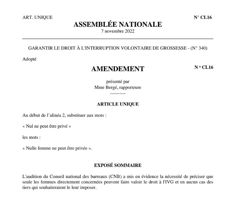 Une bonne nouvelle, si ce n’est que le texte adopté stipule que « nulle femme ne peut être privée du droit à l’interruption volontaire de grossesse », remplaçant la formule initiale : « nul ne peut être privé du droit à l’IVG », afin de « lever toute ambiguïté sur la possibilité qu’un tiers puisse imposer un avortement à une femme».