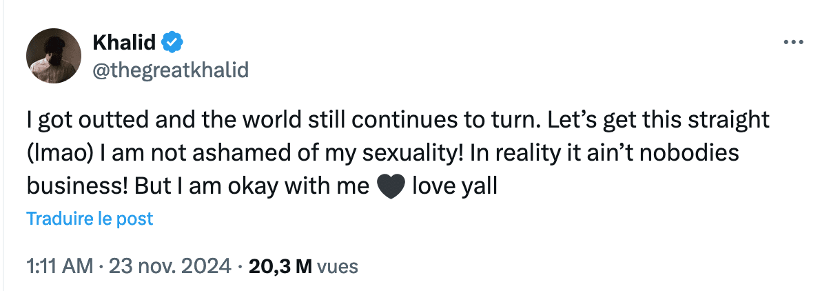 La star américaine du R&B Khalid a fait son coming out dans une série de publications sur X (anciennement Twitter), après avoir été « outé » par un certain Hugo D. Almonte, affirmant être un de ses anciens compagnons. Loin de se laisser déstabiliser ou d’alimenter la polémique, l’artiste de 26 ans a choisi de confirmer avec humour et sérénité, soulignant toutefois que sa sexualité n’avait pas à être débattue :