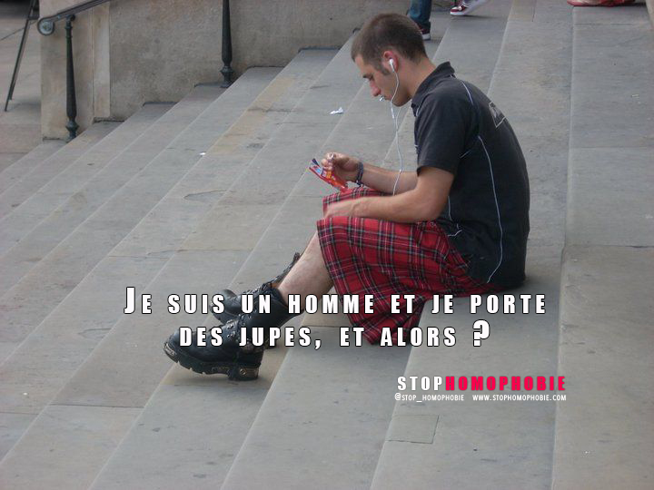 Mon kilt serré à la taille, je descend de mon immeuble, sans rencontrer de voisins. Je passe la porte, me voici dehors, potentiellement exposé au regard des autres. Je me dirige, à pied, vers le centre-ville, là où il y a le plus de monde. Dans la gueule du loup, en quelque sorte. Dans une rue piétonne, j’entends des rires derrière moi. Je jette un coup d’œil en arrière. Mais non, ce n’est pas de moi qu’on se moque.