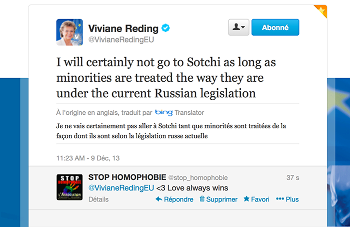 La vice-présidente de la Commission européenne, la Luxembourgeoise Viviane Reding, a annoncé lundi sur son compte twitter qu’elle ne se rendrait « certainement pas » aux Jeux olympiques d’hiver à Sotchi en raison du sort réservé aux minorités en Russie. « Je n’irai certainement pas à Sotchi tant que les minorités seront traitées de la façon dont elles sont traitées aujourd’hui par la législation russe », a écrit Mme Reding qui est également commissaire chargée de la Justice et des Droits fondamentaux.