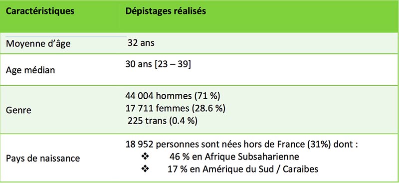 Pour 49% des personnes dépistées positives, leur dernier test remontait à moins d’un an. Sur les 464 personnes, 80% sont des hommes, 18% des femmes et 2% des personnes trans. L’âge moyen est de 35 ans.
