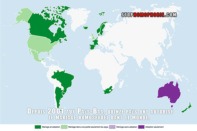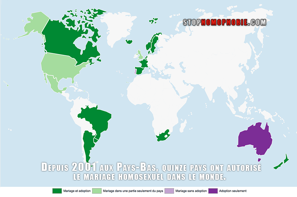 Accueil Actus Internationales La carte du mariage homosexuel dans le monde Actus Internationales Assos. LGBT Humanophobie Politiques Société Stop HomophobieThe estimated reading time is less than a minute La carte du mariage homosexuel dans le monde Revue du Web 09/08/2013 Depuis 2001 aux Pays-Bas, quinze pays ont autorisé le mariage homosexuel dans le monde. Par Alexandre Léchenet Post navigation Previous article Racisme au Maroc : Un homosexuel subsaharien témoigne ! Next article Taiwan franchit une première étape vers la légalisation du mariage gay
