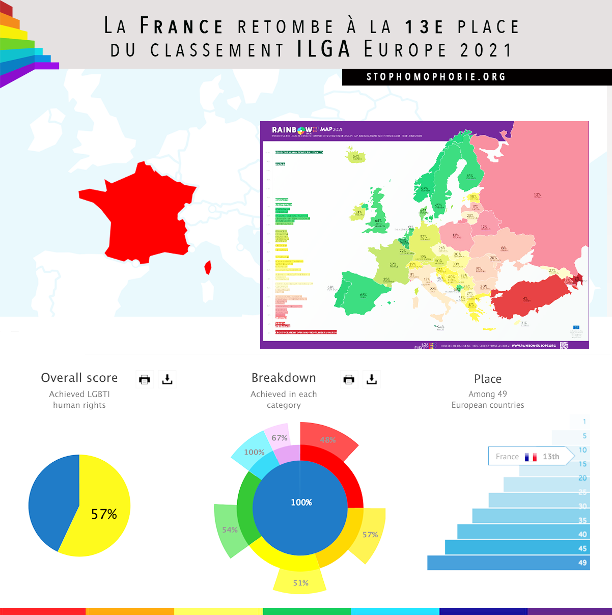 Après une remontée au 4ème rang, en décembre dernier, suite au renouvellement annoncé d’un plan d’actions contre la haine et les discriminations anti-LGBT+, la France (avec un score de 57%) retombe à la 13e place du baromètre, désormais biannuel de l’ILGA, qui évalue et classe les pays européens en fonction des droits LGBT+.