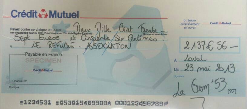 La Gom’ 53 : Des dépôts d’urnes dans des commerces et autres lieux de passage, 2 jours de quête dans le centre ville de Laval. Nous sommes fiers d’envoyer ces 2137,56€ à l’Association Le Refuge.