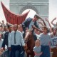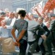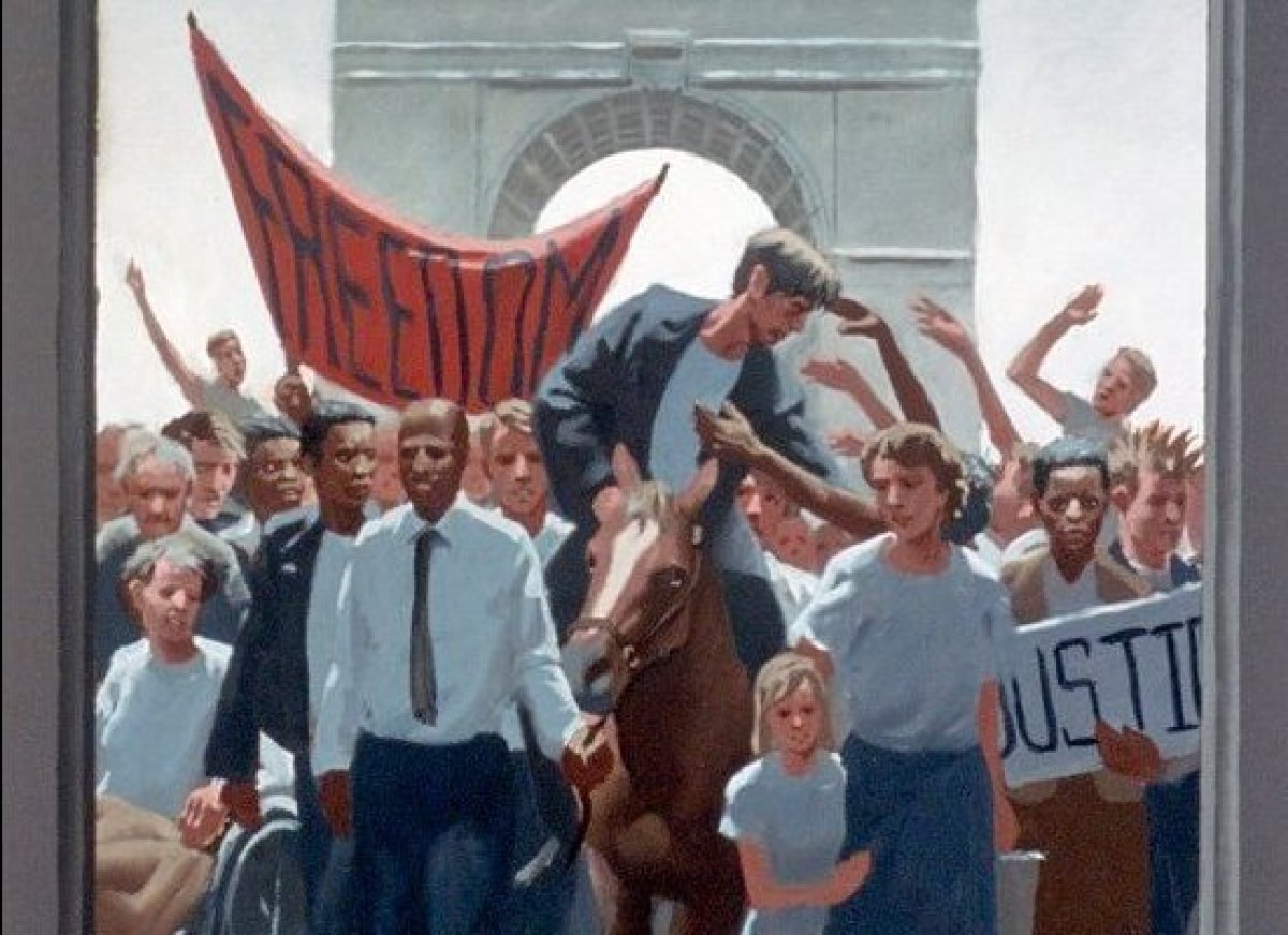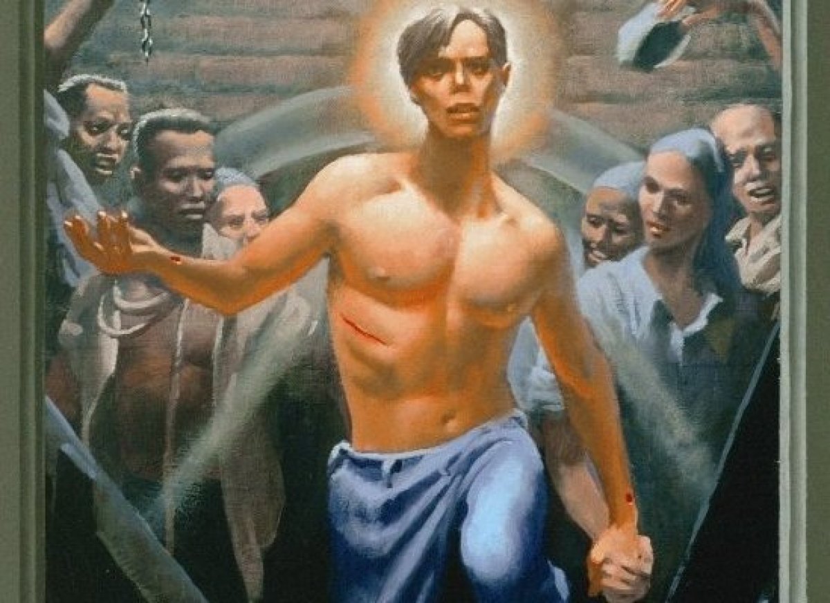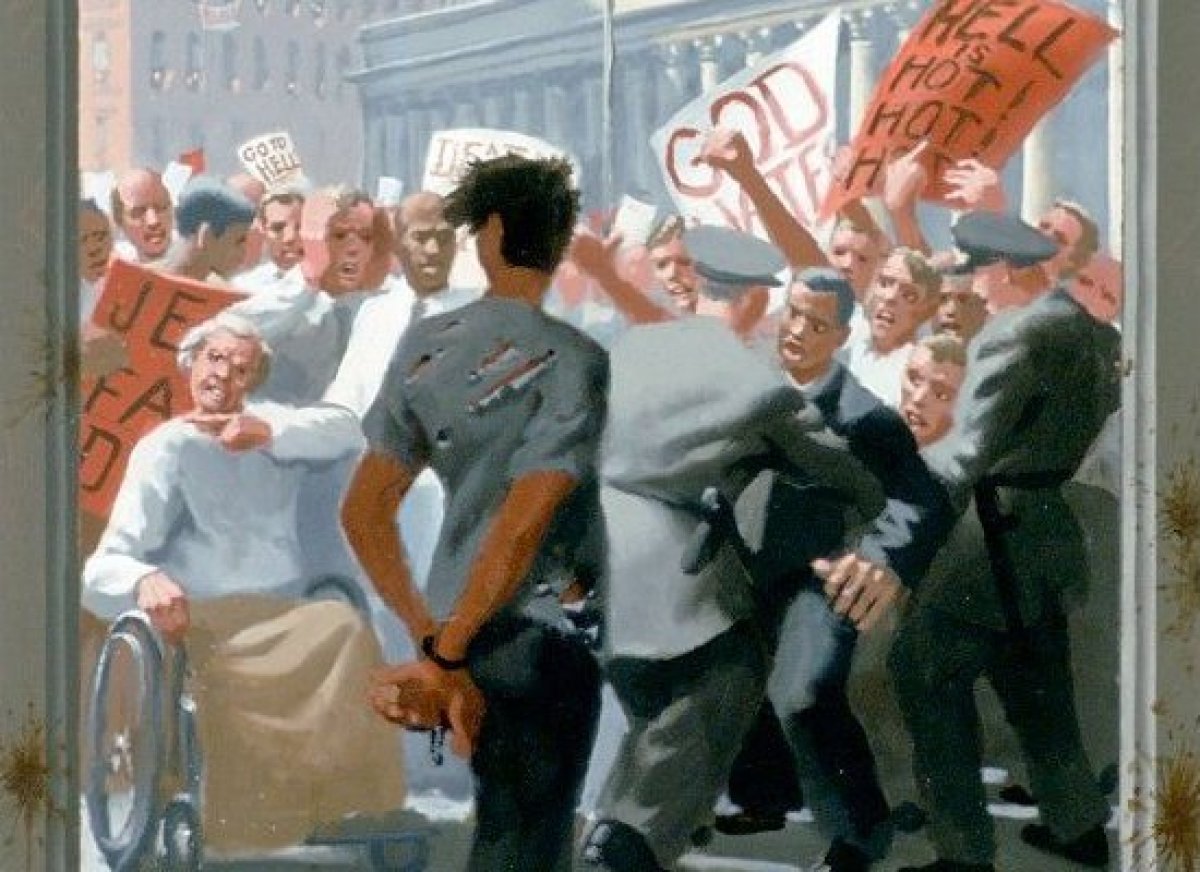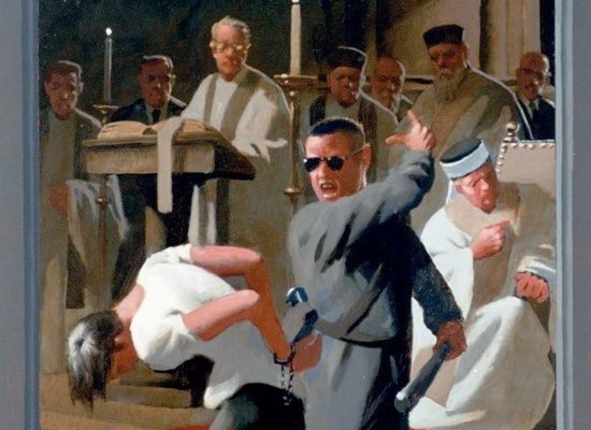 Blanchard’s gay Way of the Cross shows a contemporary Christ figure who stands up to priests, bankers, politicians, soldiers, and police — all of whom look eerily similar to the people holding those jobs today. He is jeered by fundamentalists, tortured by Marine lookalikes, killed as news cameras broadcast his pain, and rises again to enjoy homoerotic union with God.