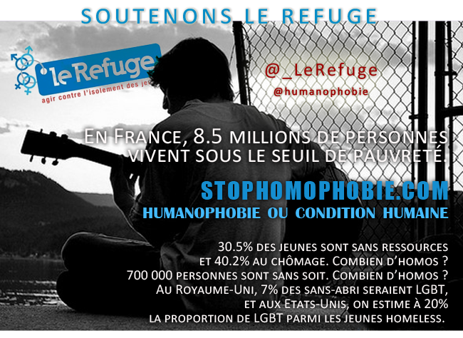 En France, 8.5 millions de personnes vivent sous le seuil de pauvreté. Combien d’homos ? 30.5% des jeunes sont sans ressources et 40.2% au chômage. Combien d’homos ? 700 000 personnes sont sans soit. Combien d’homos ? Au Royaume-Uni, 7% des sans-abri seraient LGBT, et aux Etats-Unis, on estime à 20% la proportion de LGBT parmi les jeunes homeless. Des chiffres éloquents et probablement sous-estimés. Et en France ? Homosexualité et précarité, homosexualité et sans-abrisme. Silence absolu. Une étude de l’Observatoire du Samu social de Paris de 2007 sur la sexualité des sans-abris aborde, à travers deux témoignages, la question de l’homosexualité : Xavier y confie qu’un amant jadis lui avait prédit la rue ; et Eric, bisexuel avant d’être sans domicile, témoigne de pratiques masturbatoires sous l’emprise de l’alcool avec d’autres SDF. En discutant avec des personnes accueillies dans les structures d’hébergement, on comprend parfois qu’un lien étroit existe entre homosexualité et parcours d’exclusion. Pourtant, du côté des associations d’hébergement, le sujet paraît tabou. Et du côté des associations communautaires, on préfère souvent penser qu’en s’occupant de tous, on s’occupe forcément des plus en précarité. Faux.