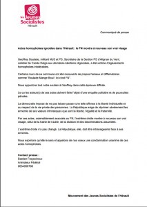 « Geoffrey Boulade, militant MJS et PS, Secrétaire de la Section PS d’Alignan du Vent, colistier de Carole Delga aux dernières élections régionales, a été victime d’agissements homophobes intolérables », c’est en ces termes que le mouvement des jeunes socialistes de l’Hérault s’indigne des propos « haineux et insultants » tagués sur les murs d’Alignant-du-Vent et qui seraient attribués au Front national. « Le FN montre à nouveau son vrai visage. Celui de la haine de l’autre, de la division et des discriminations assumées ».