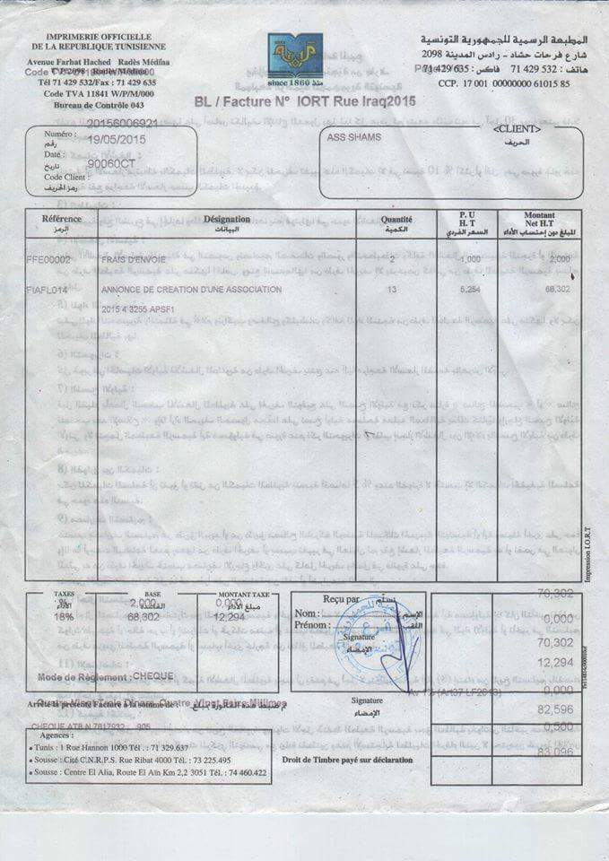 Des « allégations » dénoncées par l’association qui a immédiatement publié « la facture de paiement des frais », qui prouve effectivement le dépôt des statuts au Journal officiel de la République tunisienne. Mais, quand bien même…