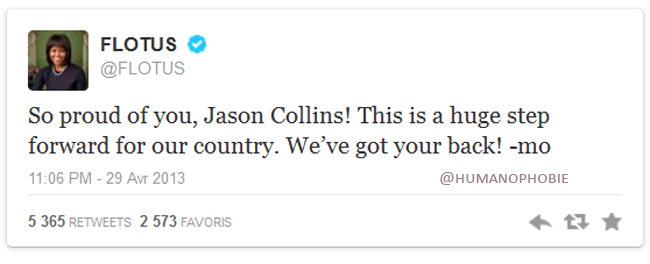 «Tellement fière de toi, Jason Collins! C’est un énorme pas en avant pour notre pays. On est avec toi !», a écrit la First Lady sur le compte Twitter de son bureau (@Flotus). Le message est signé «mo», ce qui signifie que c’est bien l’épouse du président Barack Obama qui l’a rédigé.