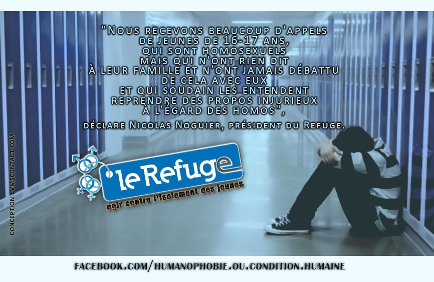 « Nous recevons beaucoup d’appels de jeunes de 16-17 ans, qui sont homosexuels mais qui n’ont rien dit à leur famille et n’ont jamais débattu de cela avec eux et qui soudain les entendent reprendre des propos injurieux à l’égard des homos », déclare Nicolas Noguier, président du Refuge.