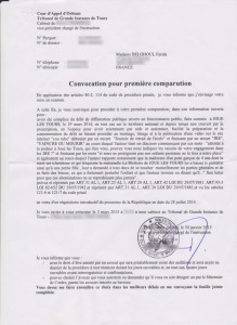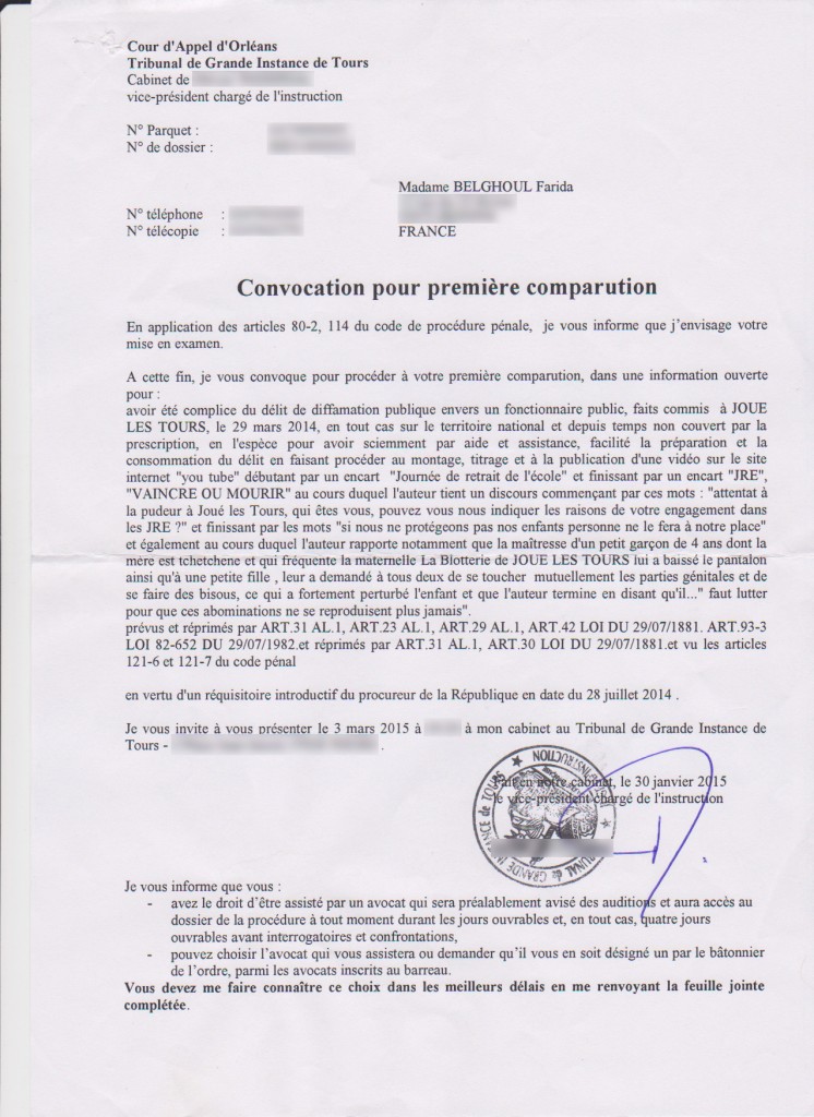 Sur son site Internet, la fondatrice de l’association radicale de la Journée de retrait de l’école (JRE), a annoncé qu’elle était convoquée le mardi 3 mars au tribunal de grande instance de Tours, pour une première comparution, en vue d’une mise en examen pour diffamation dans l’affaire de l’école Blotterie, à Joué-lès-Tours, en mars 2014.