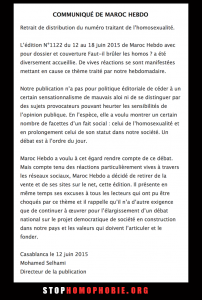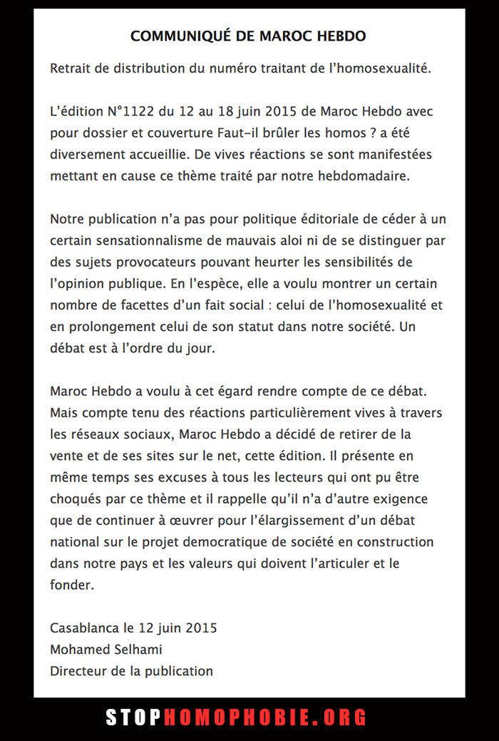 « FAUT- IL BRÛLER LES HOMOS ? » : Suite à nos vives réactions et sous le feu des critiques, dans un communiqué, Mohamed Selhami, Directeur de la publication, coutumier des unes provocatrices, annonce pourtant que l’édition N°1122 du 12 au 18 juin 2015 est retirée de la vente et de ses sites sur le net :