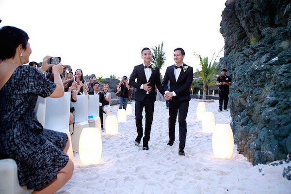 Quelques semaines après la levée de l’interdiction du mariage de même sexe, Anh Tuan Adrian, célèbre styliste pour la marque « Valenciani », également juge et invité régulier de l’émission vietnamienne « Next Model » et son compagnon, Doan, fils d’un entrepreneur, ont échangé leurs vœux ce 24 janvier dernier, devant une cinquantaine d’invités, et sur une plage cinq étoiles, dans une station de la ville côtière de Nha Trang.