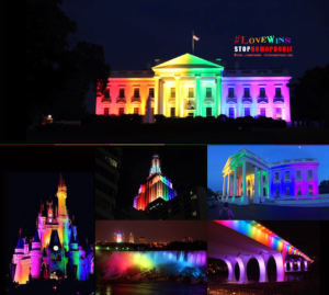 « L’Amérique peut être fière » ! Et c’est logiquement qu’à l’annonce de la décision de la Cour suprême, toute l’administration de Monsieur Obama s’est mise au diapason avec des vidéos, des photos, des messages à envoyer pour montrer son soutien et un avatar du compte officiel modifié. Du château de Disneyworld à l’Empire State Building en passant par les chutes du Niagara (côté américain), l’hôtel de ville de San Francisco, le pont de Minneapolis… et la Maison Blanche, à travers tout le pays, les monuments se sont progressivement éclairés aux couleurs de l’arc-en-ciel.
