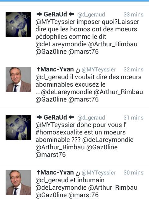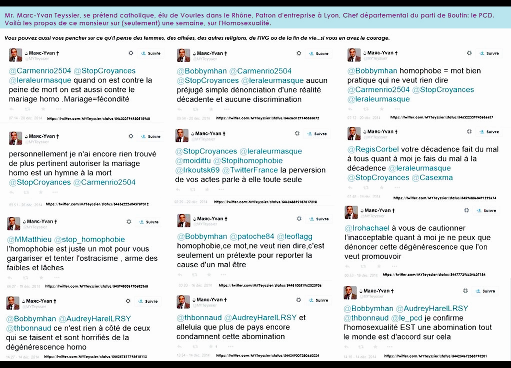 Voilà quelques uns des propos tenus depuis des mois par Marc-Yvan Teyssier, élu de la ville de Vourles (69), président de la délégation du Rhône pour le Parti chrétien-démocrate, fondé par Christine Boutin.