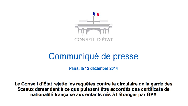 Me Patrice Spinosi, représentant les époux Mennesson, qui ont eu deux petites filles en octobre 2000 d’une GPA aux Etats-Unis et sont intervenus en défense de la circulaire dans ce dossier, a salué cette « confirmation de l’existence d’un statut pour les enfants nés d’une GPA. » Mais pour lui, « ce n’est qu’un premier pas », avant la transcription dans l’état civil français de l’état civil étranger de ces enfants.