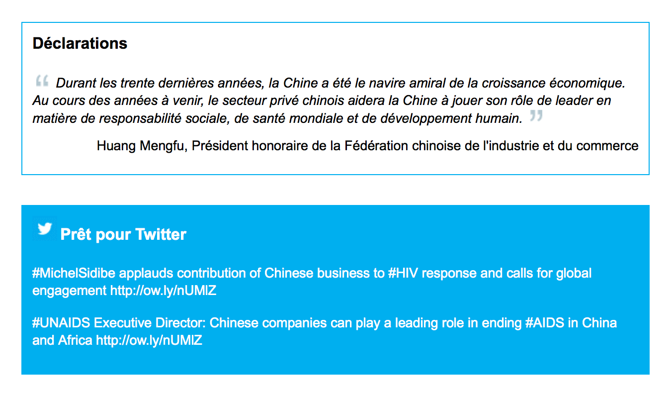 M. Sidibé a également mis en avant l’énorme potentiel du secteur privé chinois en pleine croissance pour contribuer à mettre un terme à l’épidémie de sida dans le monde. Plus particulièrement en Afrique, où de nombreuses entreprises chinoises mènent aujourd’hui des activités à grande échelle, ces entreprises occupent une position unique pour encourager des progrès majeurs dans la riposte au VIH et dans le secteur de la santé en général. Renouvelant l’engagement de l’ONUSIDA à travailler en étroite collaboration avec les entreprises privées, M. Sidibé a insisté sur le fait que le succès de la riposte au VIH nécessitait une participation forte et intelligente de tous les secteurs de la société.