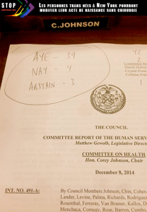 Michael Silverman, directeur exécutif de l’association « Transgender Legal Defense & Education Fund », a félicité les membres du Conseil et plus particulièrement Corey Johnson, pour cette avancé qui devrait effectivement « considérablement améliorer la vie des personnes transgenres nées à New York, » l’un six États américains, avec Washington DC, à autoriser désormais la modifications des certificats de naissance, sans preuve de la chirurgie.