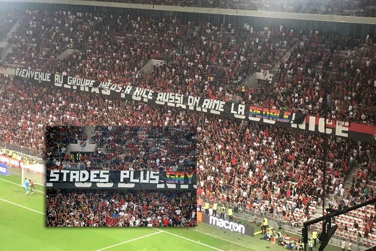Deux banderoles ont également été déployées dans les tribunes, sur lesquelles on pouvait lire : « LFP/Instance: des parcages pleins pour des stades plus gay », et « Bienvenue au groupe Ineos (qui vient de racheter le club, ndlr) : à Nice aussi on aime la « pédale » ! »