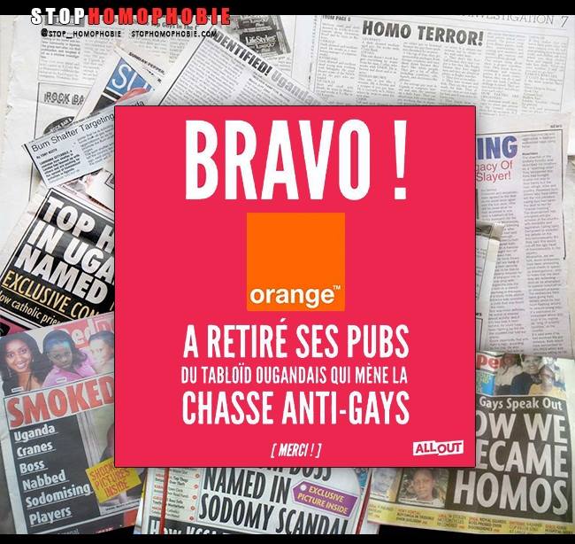 Cette semaine, à la suite du même appel lancé par les membres d’All Out, Orange a également retiré ses publicités du tabloïd ougandais Red Pepper, qui a récemment publié les noms, photos et adresses d’individus « suspectés » homosexuels en Ouganda, ce qui n’est pas sans rappeler l’affaire David Kato, un militant ougandais qui avait été « outé » dans un autre tabloïd ougandais en 2009 et tué deux jours plus tard.