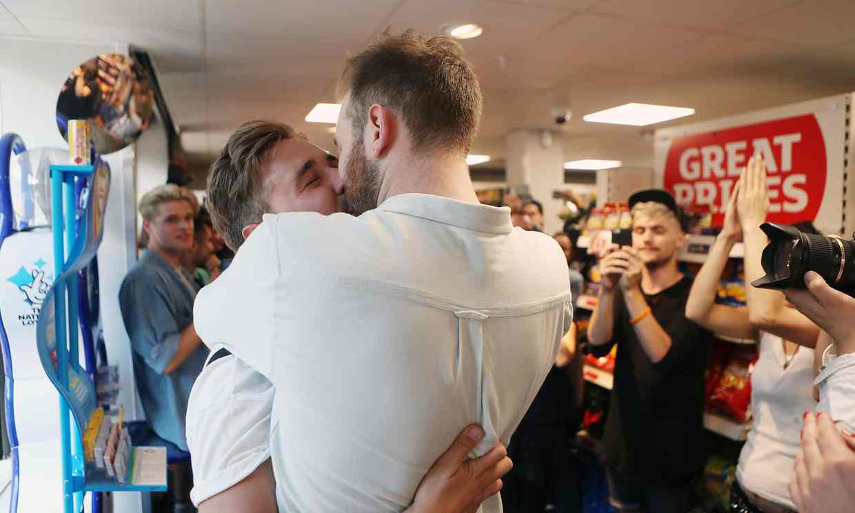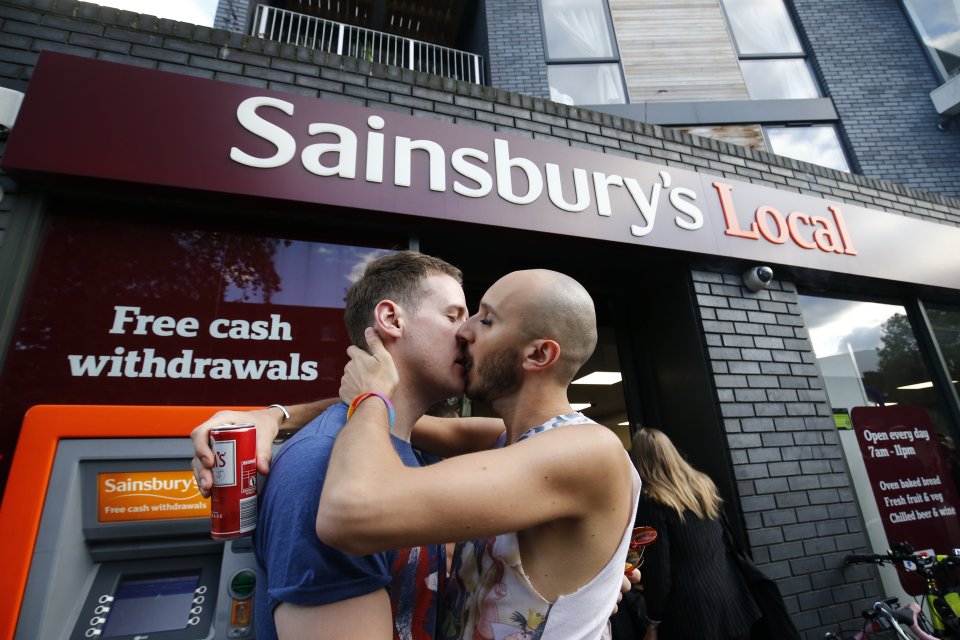 It was a defiant public display of affection like no other. About 200 people wielding rainbow flags filled the aisles of a Sainsbury’s store to stage a mass « kissathon » in protest after a gay couple were ejected from the supermarket for holding hands.
