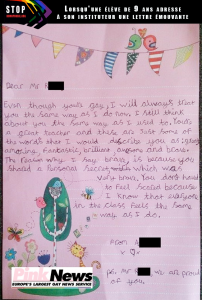 “Even though you’re gay, I will always treat you the same way as I do now. I still think about you the same way as I used to. You’re a great teacher and these are just some of the word’s (sic) that I would describe you as: great, amazing, fantastic, brilliant, awesome and brave.
