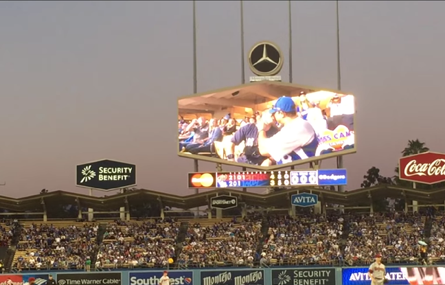 A spokesperson for the L.A. Dodgers declined to comment on whether Saturday’s game marked the first time a same-sex couple has been featured on the Kiss Cam at Dodger Stadium, but the Huffington Post reports that the Dodgers’ rivals, the San Francisco Giants, spotlighted a same-sex kiss during a 2011 game for LGBT Night Out at San Francisco’s AT&T Park.