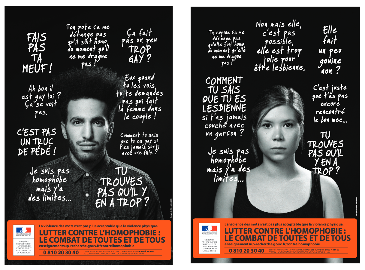 Pour l’Enseignement supérieur et la Recherche, la campagne s’appuie sur la diffusion d’outils de prévention et d’information, notamment un jeu de quatre affiches reprenant le message « Lutter contre l’homophobie : le combat de toutes et de tous ». Un portail d’entrée unique est mis en place sur le site internet, afin de permettre aux étudiants et aux personnels de disposer de ressources – notamment le nouveau guide « (re)connaître pour mieux agir », réalisé en collaboration avec la Ligne Azur et l’Inter-LGBT – utiles pour accompagner les personnes souffrant discrimination en raison de leur orientation sexuelle et/ou identité sexuelle réelle ou supposée. Le service d’écoute et d’aide disponible au 0 810 20 30 40 ou par mail, 7j/7 de 8h à 23h.