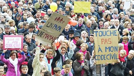 On pensait la France mal en point. C’est vrai, économiquement parlant, c’est la galère (au deuxième trimestre 2012, la dette française atteignait 91% du PIB, ce qui représente la modique somme de 1832,6 milliards d’Euros à rembourser) ; financièrement, on patauge, malgré les taux d’intérêt plutôt bas alloués par les investisseurs ; politiquement, la crise de confiance avec l’exécutif socialiste s’accélère (36% de cote de popularité pour François Hollande en janvier 2013, d’après les derniers chiffres). Mais là, tous les ramassis de connards semblent s’être donnés le mot, dimanche 13 janvier, pour enfoncer la tête dans une bouse bien puante des quelques doux rêveurs qui croyaient encore à la Belle Epoque. Seulement, Madame, Monsieur, et même toi, là, petit enfant déjà embrigadé dans la perversité dangereuse de tes parents, sachez que battre le pavé pour défendre des « valeurs profondes » ne dissimule pas le fait que vous n’êtes qu’un tas de cons embués dans vos soi-disant croyances.