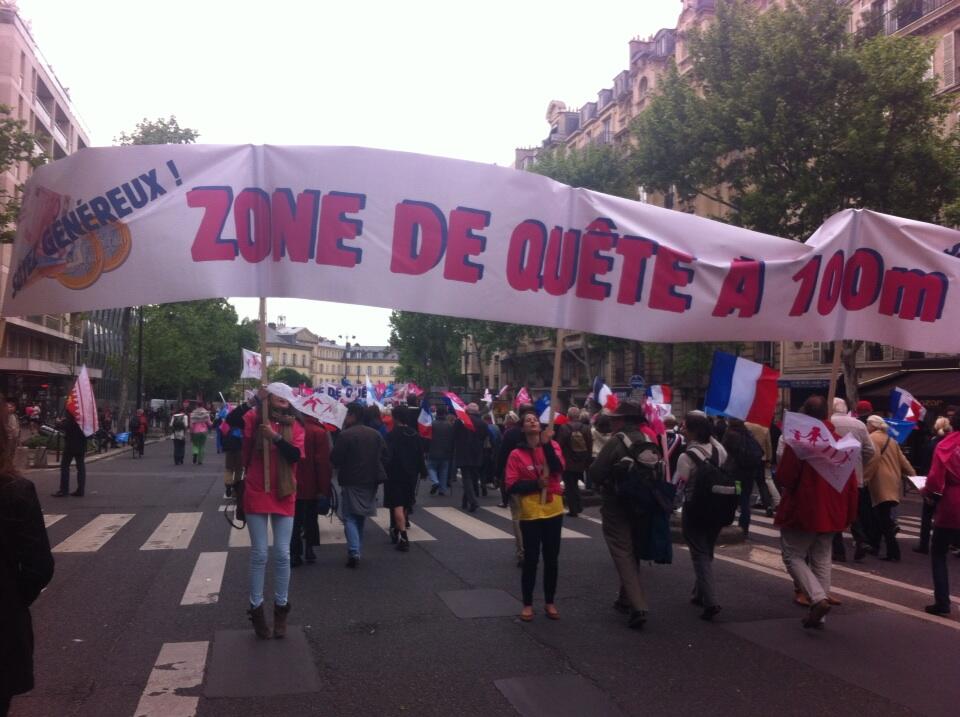 Une quête pour les manifestations ??!! Une quête est organisée dans les cortèges pour recueillir des fonds pour l’organisation de la manifestation. « Du pognon, du pognon, pour la manifestation! », entend-on. Dans les sacs, beaucoup de pièces et quelques billets de 10 et de 20 euros, constate une de nos journalistes.