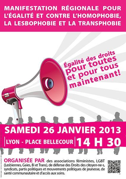 Les associations Lesbiennes, Gaies, Bi et Trans (LGBT), féministes, de défense des droits des citoyen-ne-s, de santé communautaire et d’accès au soin, Syndicats, Partis politiques et mouvements politiques de jeunesse organisent une action unitaire le 26 janvier 2013 à 14h30
