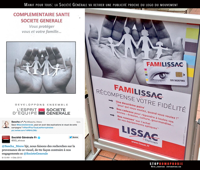 La Société Générale n’est pas la première à être épinglée pour avoir repris le logo de la Manif pour tous. En mai dernier, la même image en noir et blanc a été retrouvée sur une publicité pour la carte « famille » de l’opticien Lissac.