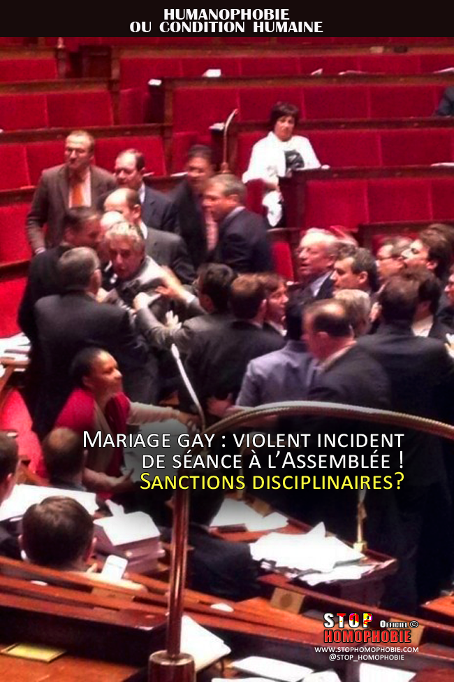 « Hervé Mariton désigne un rapporteur du doigt. Plusieurs de ses collègues UMP l’imitent. Quelques uns bondissent, Yves Albarello, Philippe Meunier et Daniel Fasquelle en tête. Les huissiers s’interposent en masse pour protéger le fonctionnaire. Attroupement général. Ça se bouscule, ça vocifère de toutes parts. Xavier Breton hurle : « Les fonctionnaires doivent rester neutres, c’est pas le lobby LGBT qui gouverne ! » ».