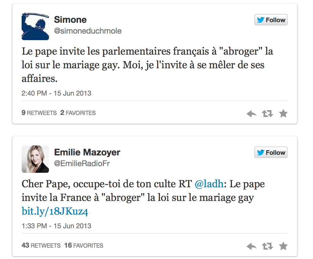 Le député socialiste Thomas Thévenoud, présent lors de la rencontre, a défendu les propos du pape sur son compte Twitter :
