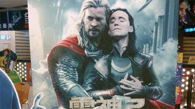 Un cinéma de Shanghai a diffusé par erreur le montage photo d’une fan en guise d’affiche promotionnelle du blockbuster Thor 2 : Le monde des ténèbres. Le poster de Thor enlaçant Loki a amusé les réseaux sociaux.
