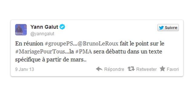 C’est confirmé: l’amendement ouvrant la procréation médicalement assistée (PMA) aux couples de femmes ne figurera pas dans le texte sur le mariage pour tous. C’est ce qu’a annoncé ce mercredi Bruno Le Roux, le chef de file des députés PS, aux élus de son groupe lors d’une réunion. La PMA sera finalement examinée au sein d’un texte sur la famille qui sera débattu au mois de mars, comme l’indique sur Twitter le député du Cher Yann Galut.