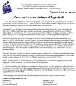 Un acte de censure inédit qui « bafoue la liberté d’expression », s’insurge dans son communiqué l’Association de Défense du Cinéma Indépendant, des Films d’Auteurs et des salles d’Art et d’Essai (ADCI), qui avait proposé le film. Elle le fait régulièrement dans les cinémas d’Argenteuil, à raison de 10 séances par an depuis 17 ans. À l’issue de chaque projection, un débat avec le réalisateur ou un protagoniste du monde du cinéma permet à toutes les opinions de s’exprimer. Mais Monsieur le maire en aura décidé autrement !