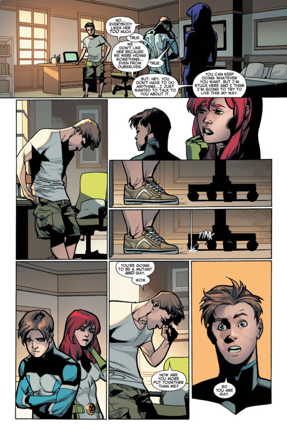 Now Uncanny X-Men writer Brian Michael Bedis has addressed the issue by having the younger Iceman confront present day Iceman for being still in denial about his sexual orientation – asking him if he really wants to continue living that way.