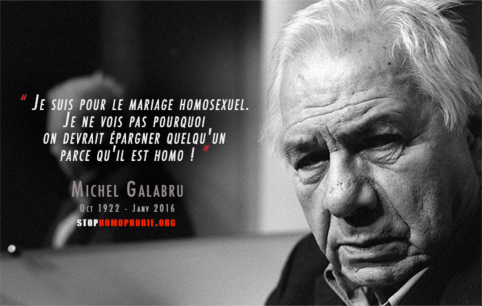 Marié à deux reprises et père de trois enfants, Michel Galabru avait publié en 1996 un livre de souvenirs, Je l’ai perdue au 18. En 2006 dans « Pensées, répliques et anecdotes », il écrivait : « Je suis pour le mariage homosexuel. Je ne vois pas pourquoi on devrait épargner quelqu’un parce qu’il est homo ! »