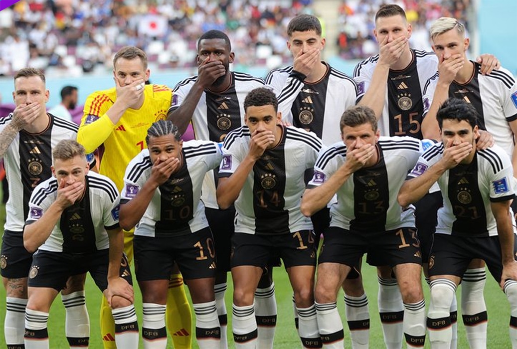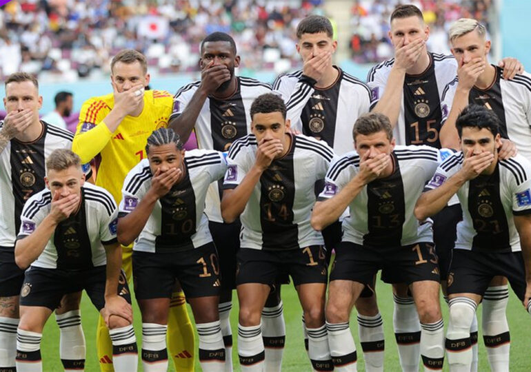 Ce mercredi 23 novembre, pour leur entrée en lice face au Japon, les joueurs allemands se sont cachés la bouche sur la photo d’équipe, en protestation aux menaces de sanctions sportives de la Fédération internationale de football (FIFA) pour empêcher notamment le port du brassard « One Love » au Qatar.