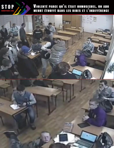 Charmante Russie, que nos politiques de l’extrême admirent… et quelle belle ville que Moscou, centre scientifique, historique, architectural et commercial, comme l’indiquent les prospectus touristiques, et où un adolescent soupçonné d’homosexualité peut se faire violenter dans une salle de classe jusqu’à mourir étouffé par ses « camarades », tordus de rire, sous le regard stoïque d’une enseignante qui se demande encore pourquoi elle serait poursuivie ?!