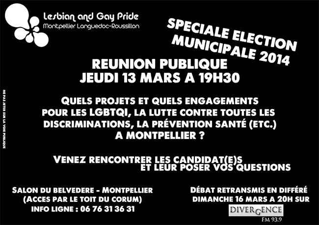Dans le cadre de l’élection municipale de Montpellier, la Lesbian & Gay Pride Montpellier Languedoc-Roussillon invite les candidats à la fonction de Maire à venir échanger, débattre et exposer leurs projets sur les thèmes suivants :