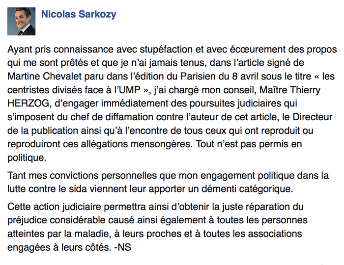 Ayant pris connaissance avec stupéfaction et avec écœurement des propos qui me sont prêtés et que je n’ai jamais tenus, dans l’article signé de Martine Chevalet paru dans l’édition du Parisien du 8 avril sous le titre « les centristes divisés face à l’UMP », j’ai chargé mon conseil, Maître Thierry HERZOG, d’engager immédiatement des poursuites judiciaires qui s’imposent du chef de diffamation contre l’auteur de cet article, le Directeur de la publication ainsi qu’à l’encontre de tous ceux qui ont reproduit ou reproduiront ces allégations mensongères. Tout n’est pas permis en politique.
